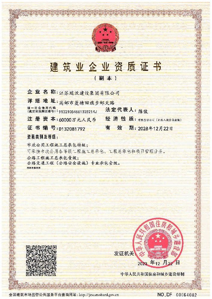 江蘇瑞沃建設集團有限公司成立于2007年,是一家以市政、交通工程建設為主導,集房屋建筑、交通安全設施、城市道路照明工程、電力工程、隧道工程、航道工程及投融資為一體的綜合性企業(yè)。企業(yè)注冊資本60000萬元,現(xiàn)有各類技術人員580人,其中中、高級以上人員498人,注冊類人員268人,一、二級建造師166人。公司榮獲“江蘇省建筑業(yè)優(yōu)秀企業(yè)”、“江蘇省五一勞動獎狀”,連續(xù)多年被評為“揚州市先進企業(yè)”、“江蘇省建筑業(yè)百強企業(yè)”,連續(xù)八年蟬聯(lián)百強企業(yè)基礎設施類第一名。