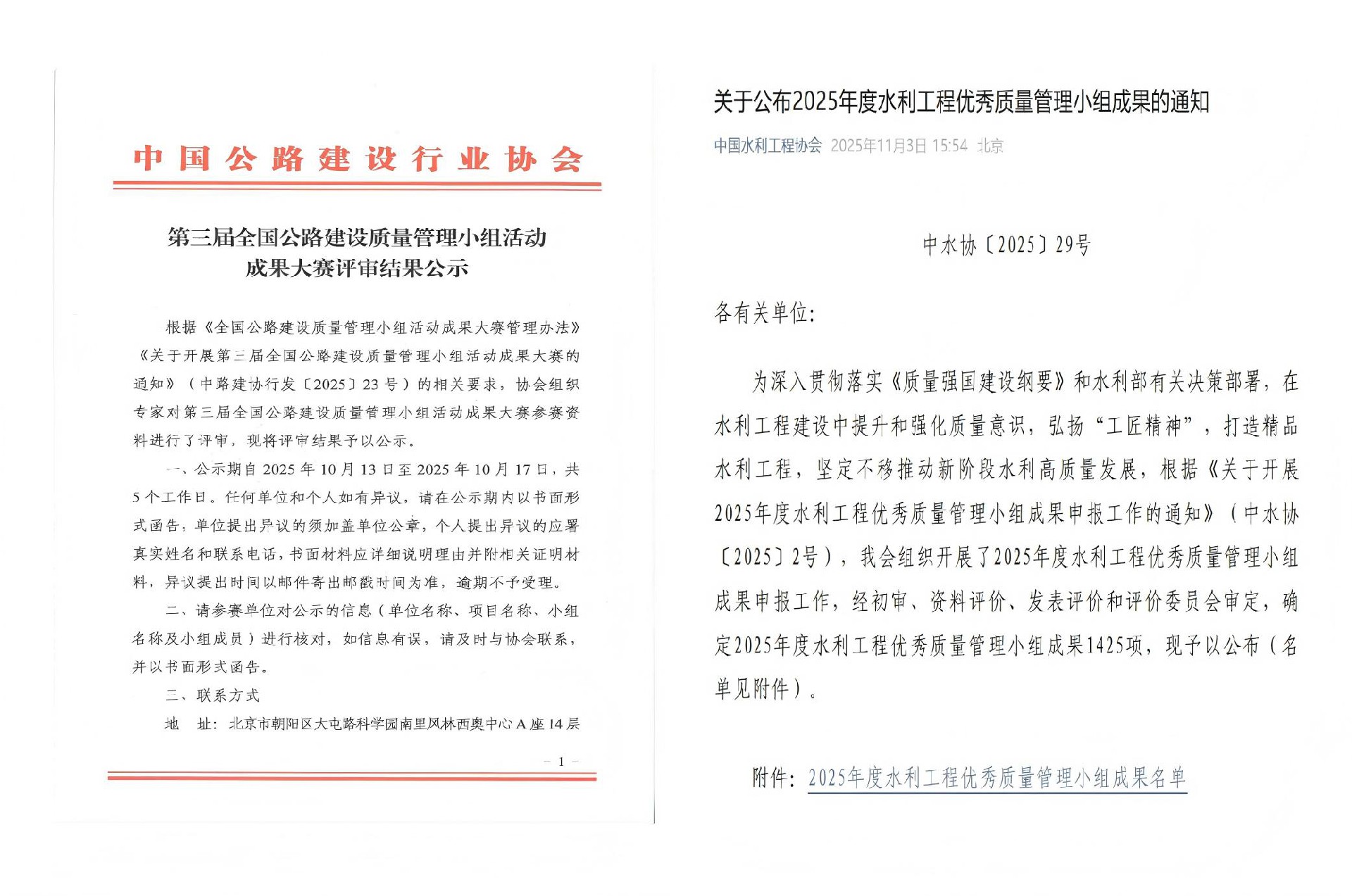 近日,中國公路建設行業(yè)協(xié)會、中國水利工程協(xié)會先后公布了第三屆全國公路建設質量管理小組活動成果評審結果和2025年度水利企業(yè)質量管理小組競賽活動結果。“···